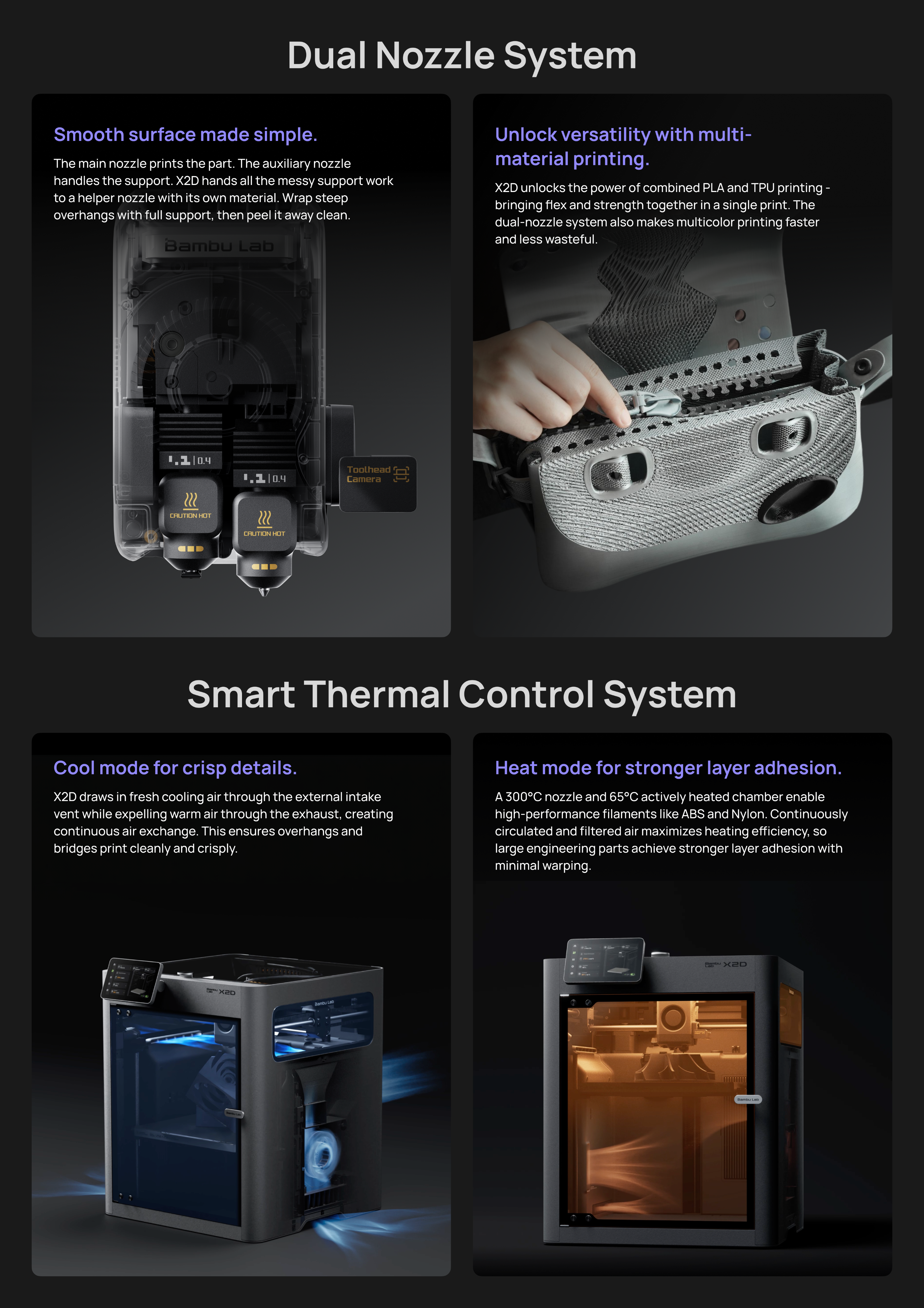 Bambu Lab X2D turi visiškai uždara konstrukcija su aktyviu kameros šildymu iki 65 °C leidžia patikimai spausdinti tokias medžiagas kaip ABS, ASA ar nailonas. Tuo tarpu vėsinimo režimas užtikrina tinkamas sąlygas PLA ir kitoms standartinėms medžiagoms.