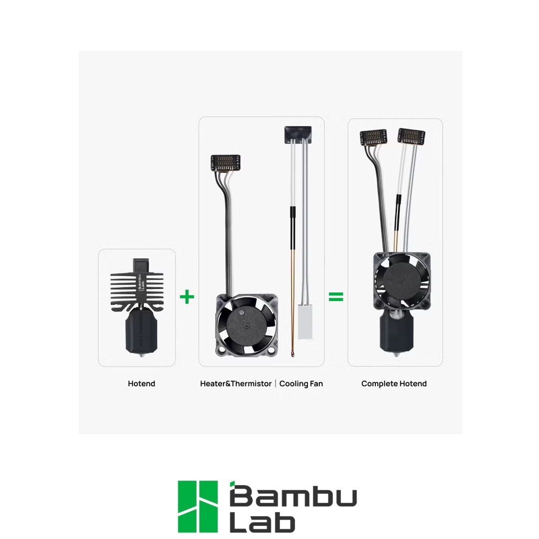 Bambu Lab P serijos pilnas hotendas (FAH001-P) su 0,4 mm grūdinto plieno antgaliu. Pilnas komplektas su heater, termistoriumi ir ventiliatoriumi.