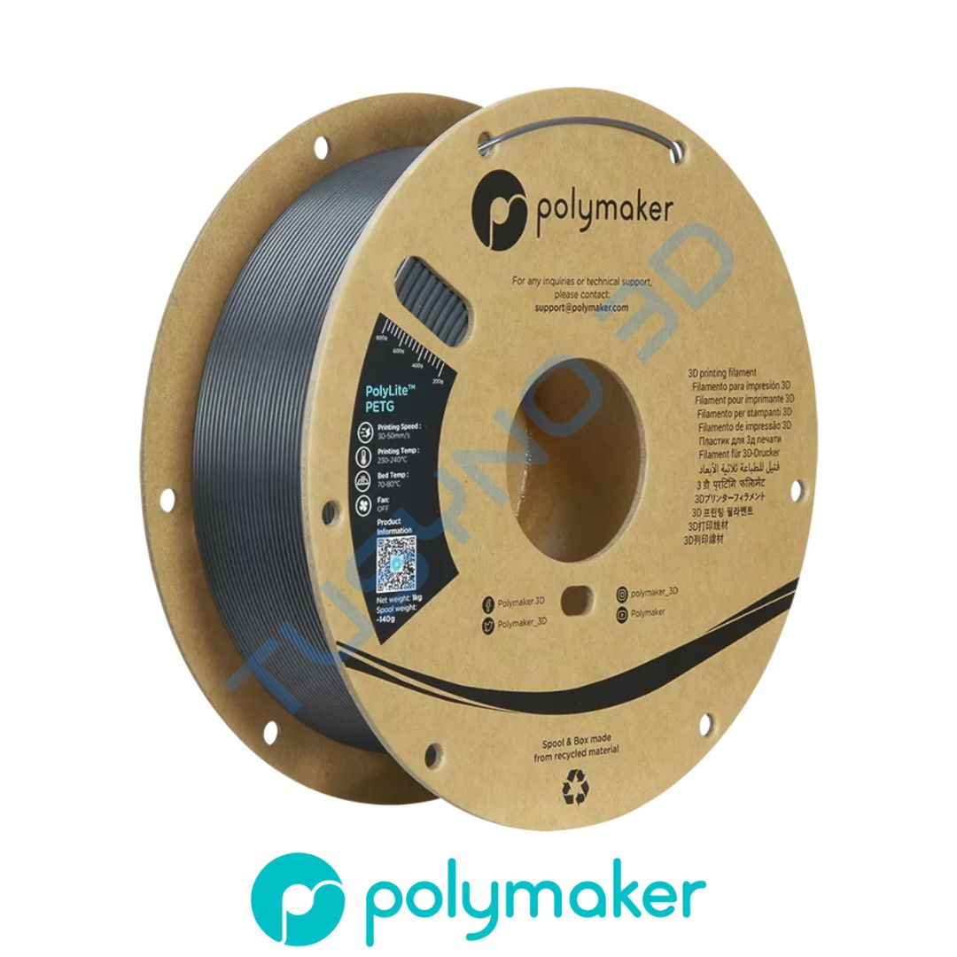 Polymaker PolyLite PETG tamsi pilka – tvirtas, patikimas 3D plastikas. Puikiai tinka techniniams, funkciniams ir dizaino projektams
